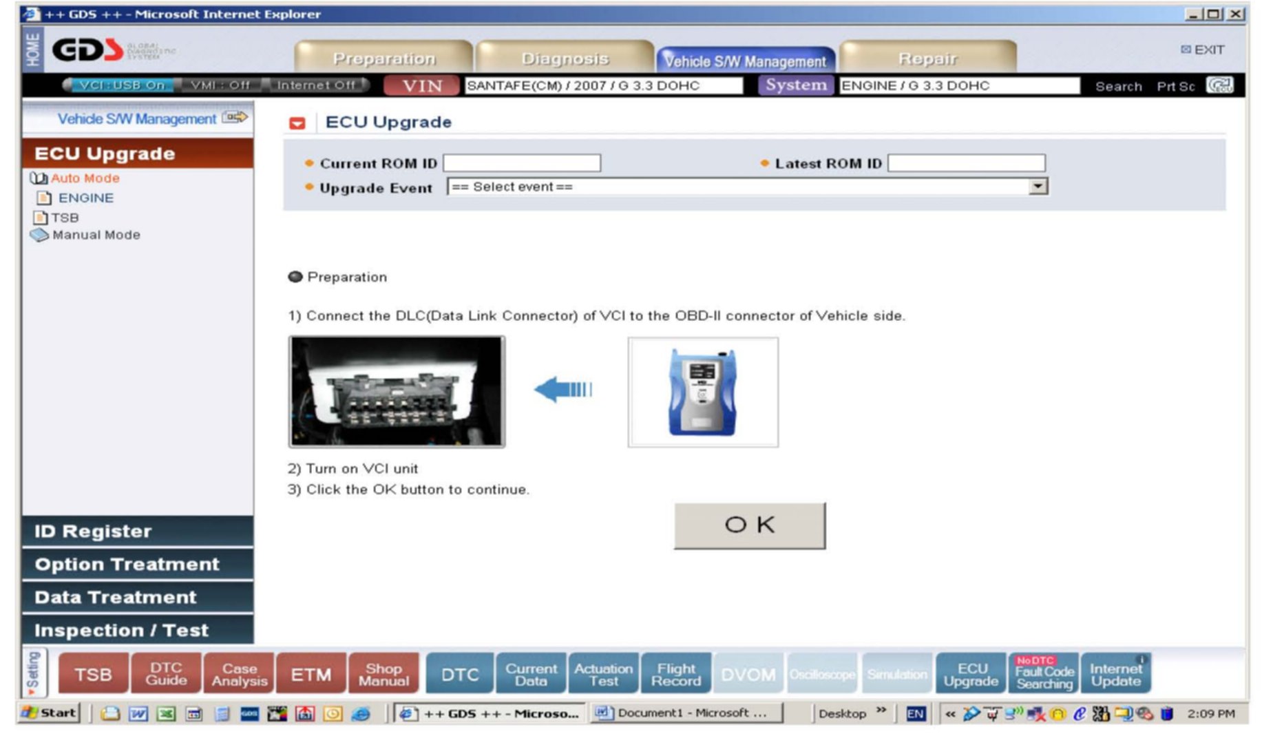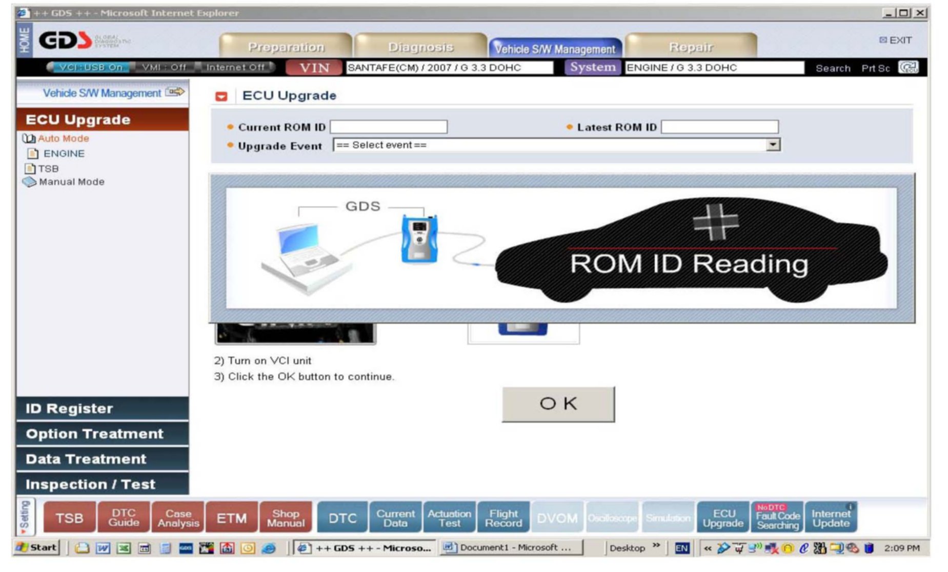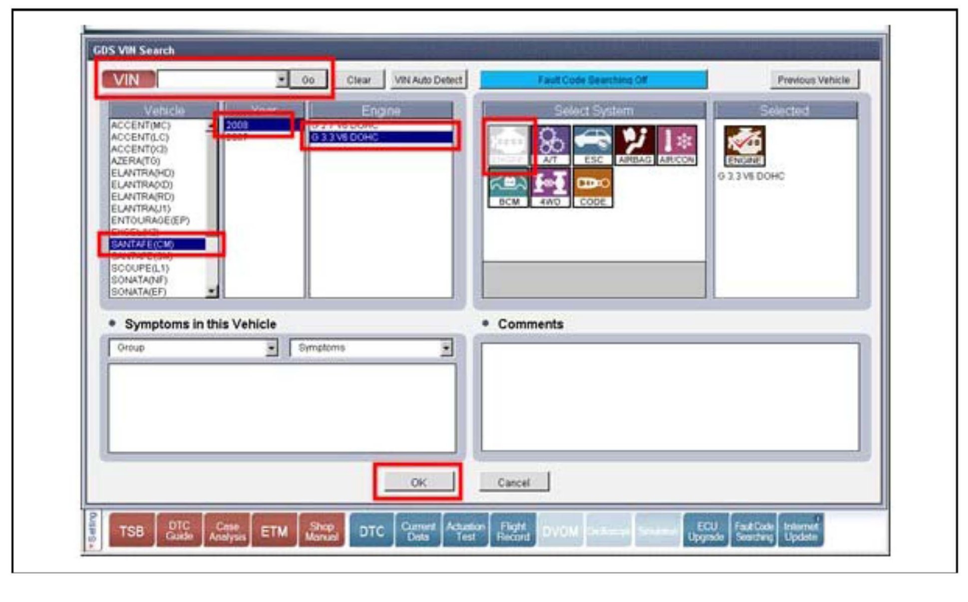 2. Enter the vehicle information by entering the vehicle's VIN or selecting the vehicle model, model year, engine/fuel type and ENGINE as the system and then click OK.