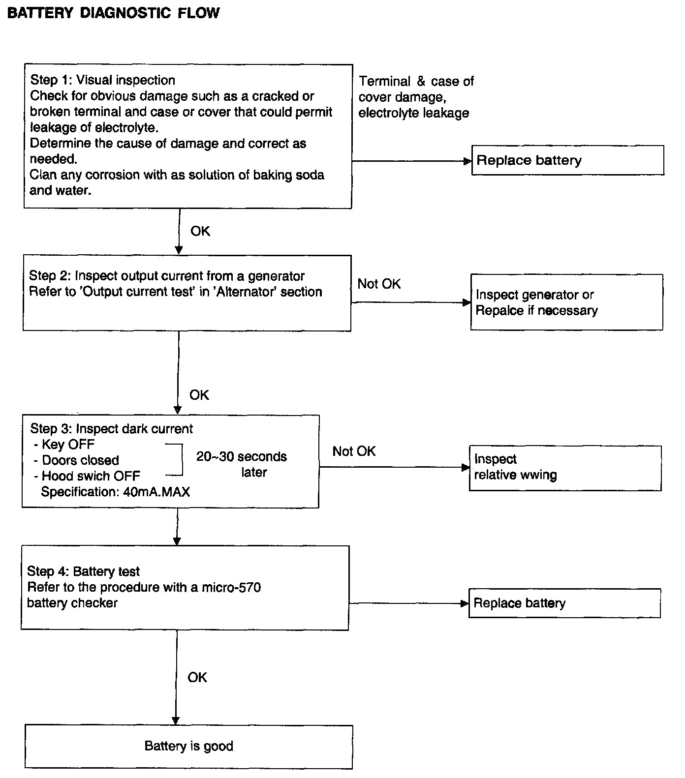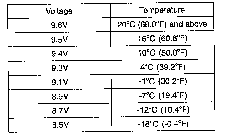 5. Compare the voltage reading with the minimum and replace the battery if battery test voltage is below that shown in the voltage table.