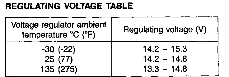 1. If the voltmeter reading agrees with the value listed in the regulating voltage table, the voltage regulator is functioning correctly. If the reading is other than the standard value, the voltage regulator or the alternator is faulty.