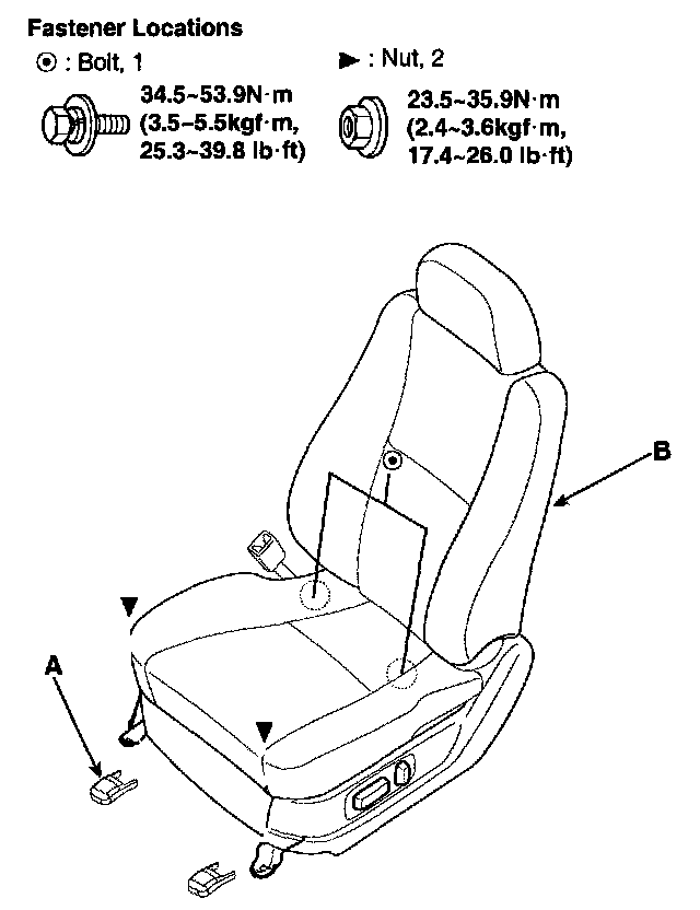 2. After loosening the seat assembly mounting bolt and nut, remove the seat assembly (B).
