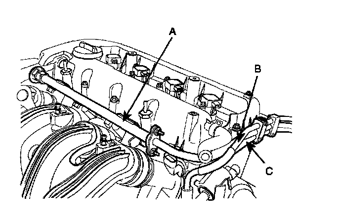 5. Remove the delivery pipe (A), brake vacuum hose (B), and PCSV hose (C).