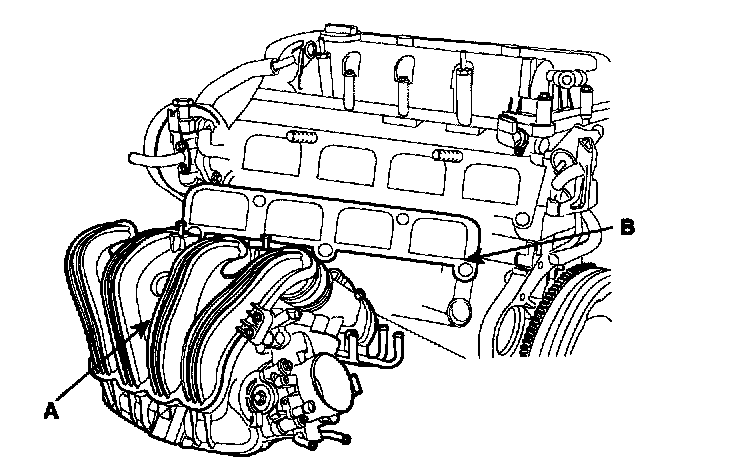 12. Remove intake manifold (A) and gasket (B).