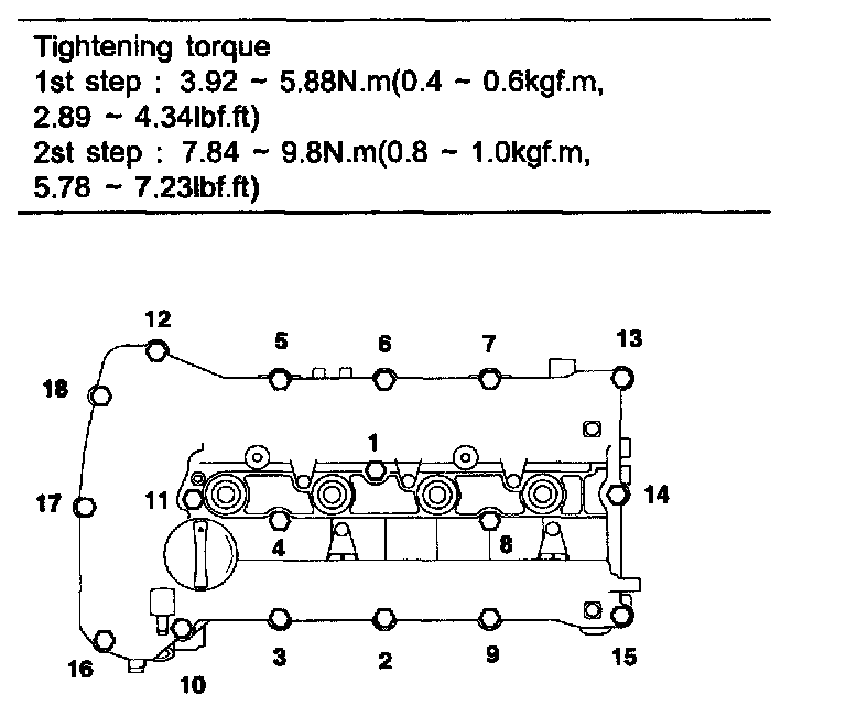 2st step: 7.84 - 9.8 Nm (0.8 - 1.0 kgf.m, 5.78 - 7,23 ft. lbs.)