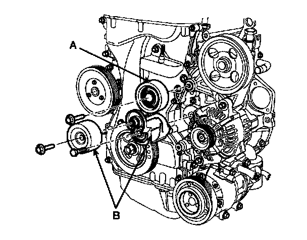 9. Remove the drive belt tensioner pulley and tensioner (B).