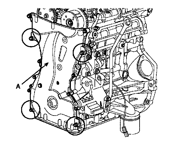 21. Remove the timing chain cover (A) by prying the portions between the cylinder head and cylinder block with a screwdriver.