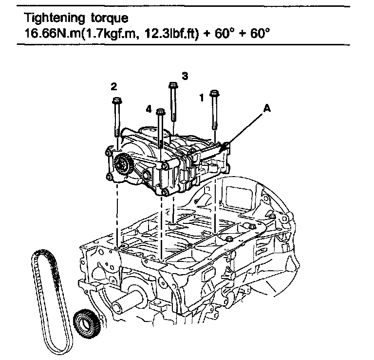 Tightening torque: 16.66 Nm (1.7 kgf.m, 12.3 ft. lbs.) + 60° + 60°
