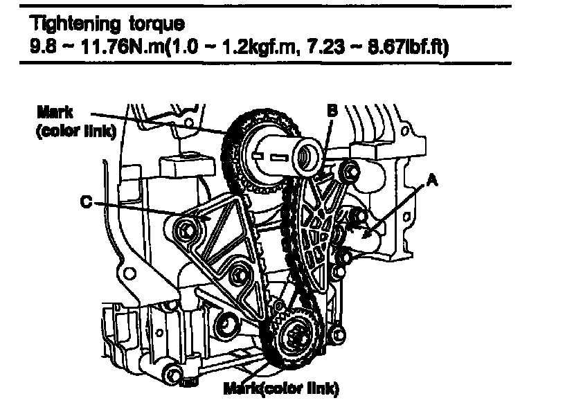 The timing mark of each sprockets should be matched with timing mark (color link) of timing chain at installing timing chain.