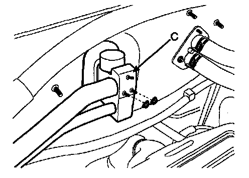 5. Remove the expansion valve (C) from evaporator core after loosening nuts. Plug or cap the lines immediately after disconnecting them to avoid moisture and dust contamination.