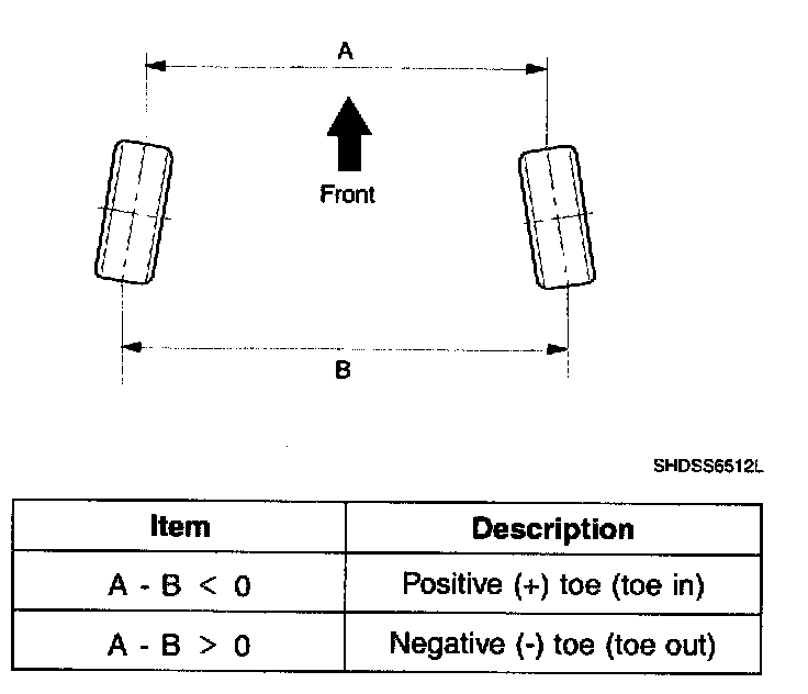 When the wheels are turned in toward the front of the vehicle, toe is positive (+) (toe in). When the wheels are turned out toward the front of the vehicle, toe is negative (-) (toe out). Toe is measured in degrees, from side to side, and totaled.