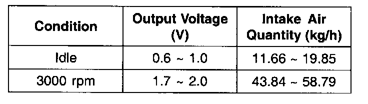 The Mass Air Flow Sensor (MAFS) is located between the air cleaner assembly and the throttle body. The MAFS uses a hot film type sensing element to measure the mass of intake air entering the engine. Mass air flow rate is measured by detecting of heat transfer from a hot film probe. The change in air flow rate causes change in the amount of heat being transferred from the hot film probe surface to the air. A large amount of intake air represents acceleration or high load conditions while a small amount of Intake air represents deceleration or idle. The ECM uses this information to determine the injection duration and ignition timing for the desired air/fuel ratio.