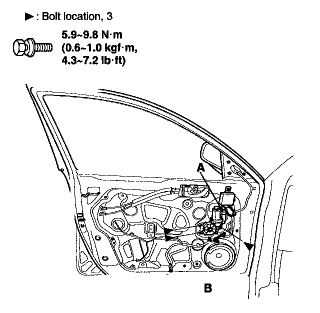 2. After disconnecting the connector (A), remove the power window motor (B).