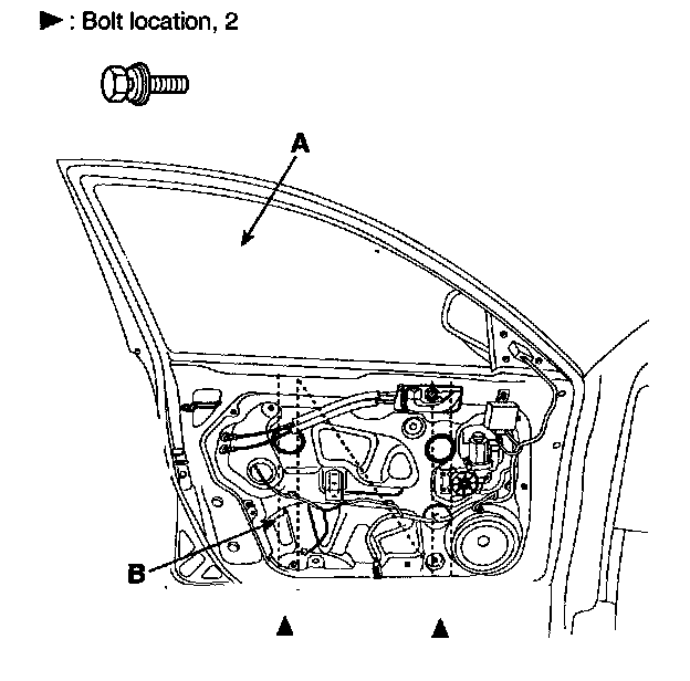 2. Carefully move the glass (A) until you can see the bolts, then loosen them. Separate the glass from the glass run and carefully pull the glass out through the window slot (B).
