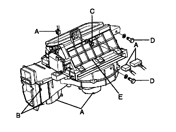Remove the self-tapping screws (B), the mounting nut (C), the mounting bolts (D) and the blower unit (E).