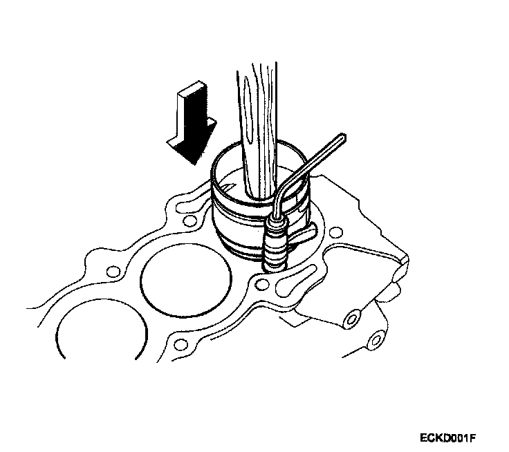 2) Install the ring compressor, check that the bearing is securely in place, then position the piston in the cylinder, and tap it in using the wooden handle of a hammer.