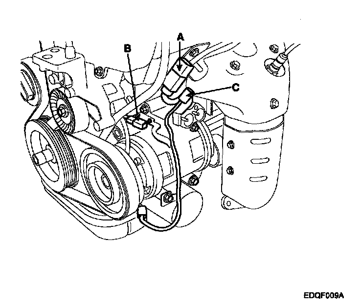 13. Disconnect heated oxygen sensor (bank 1, sensor 1) connector(A), air compressor switch connector(B) and oil pressure sensor connector(C).