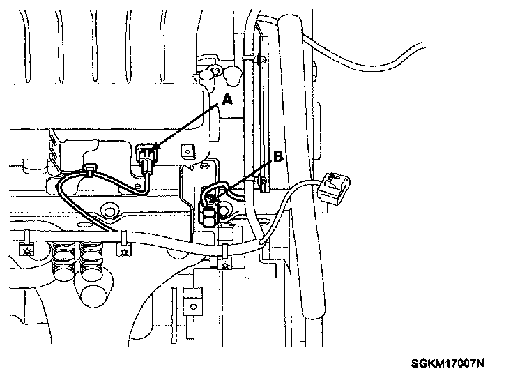 19. Disconnect the air temperature sensor (ATS) connector (A) and heated oxygen sensor (Bank 2, Sensor 2) connector (B).