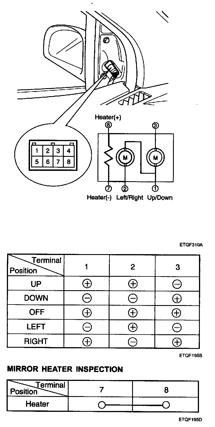 2. Apply battery voltage to each terminal as shown in the table and verify that the mirror operates properly.