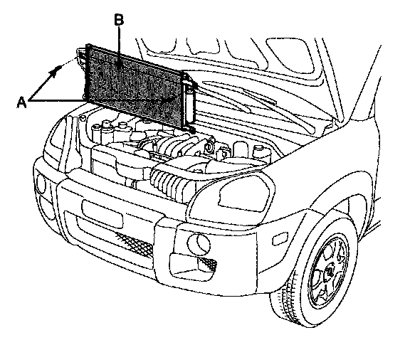 5. Remove the bolts(A), then remove the condenser(B) by lifting it up. Be careful not to damage the radiator and condenser fins when removing the condenser.