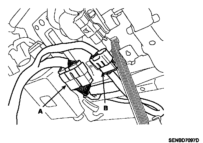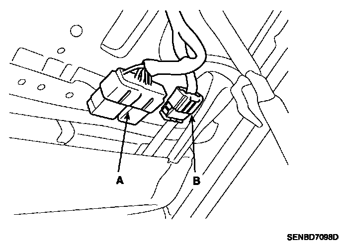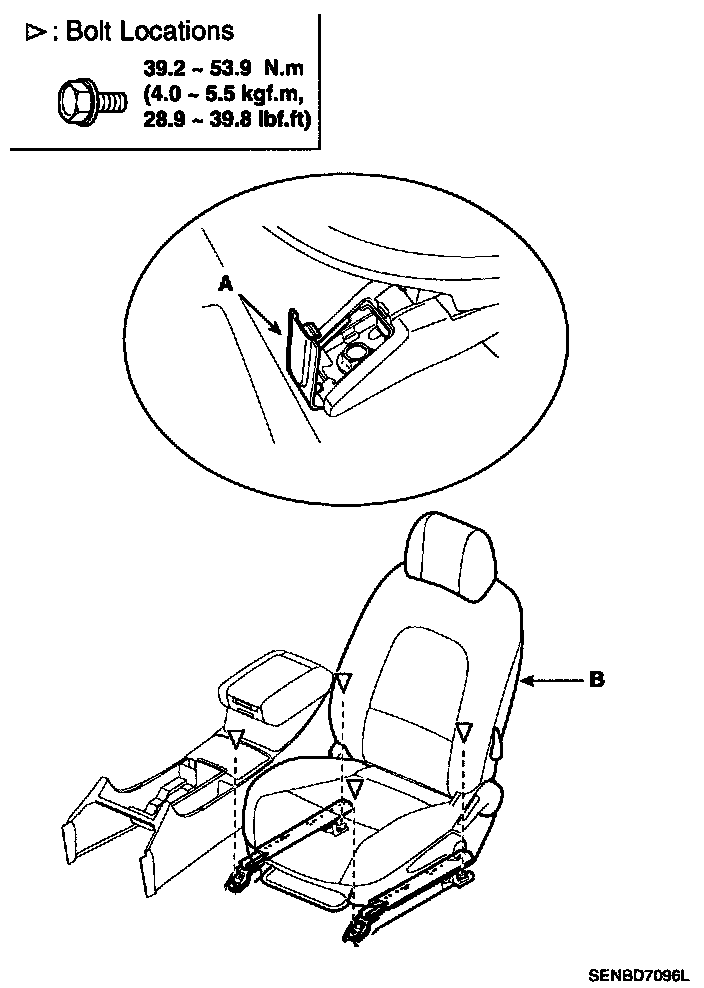 - Disconnect the power seat connector (A), airbag connector, seat heater connector, seat belt buckle connector (B) and then remove the seat assembly.