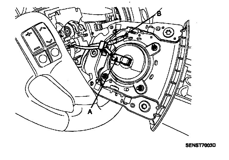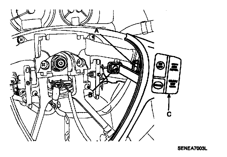 4. Disconnect the cruise control switch connector (A) and then remove the cruise control switch (C) with two screws (B).