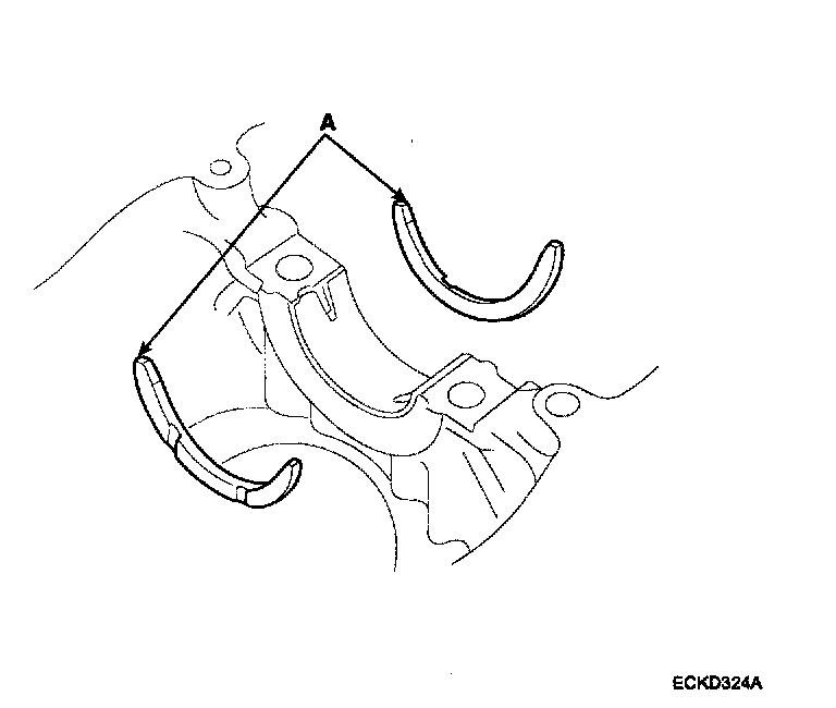 Install the 2 thrust bearings (A) under the No.3 journal position of the cylinder block with the oil grooves facing outward.