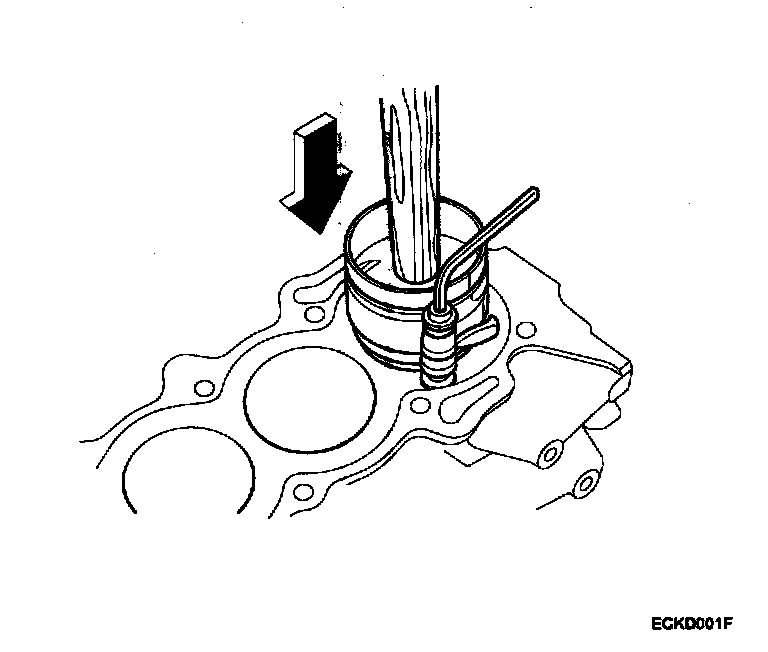 1) Install the ring compressor, check that the bearing is securely in place, then position the piston in the cylinder, and tap it in using the wooden handle of a hammer.