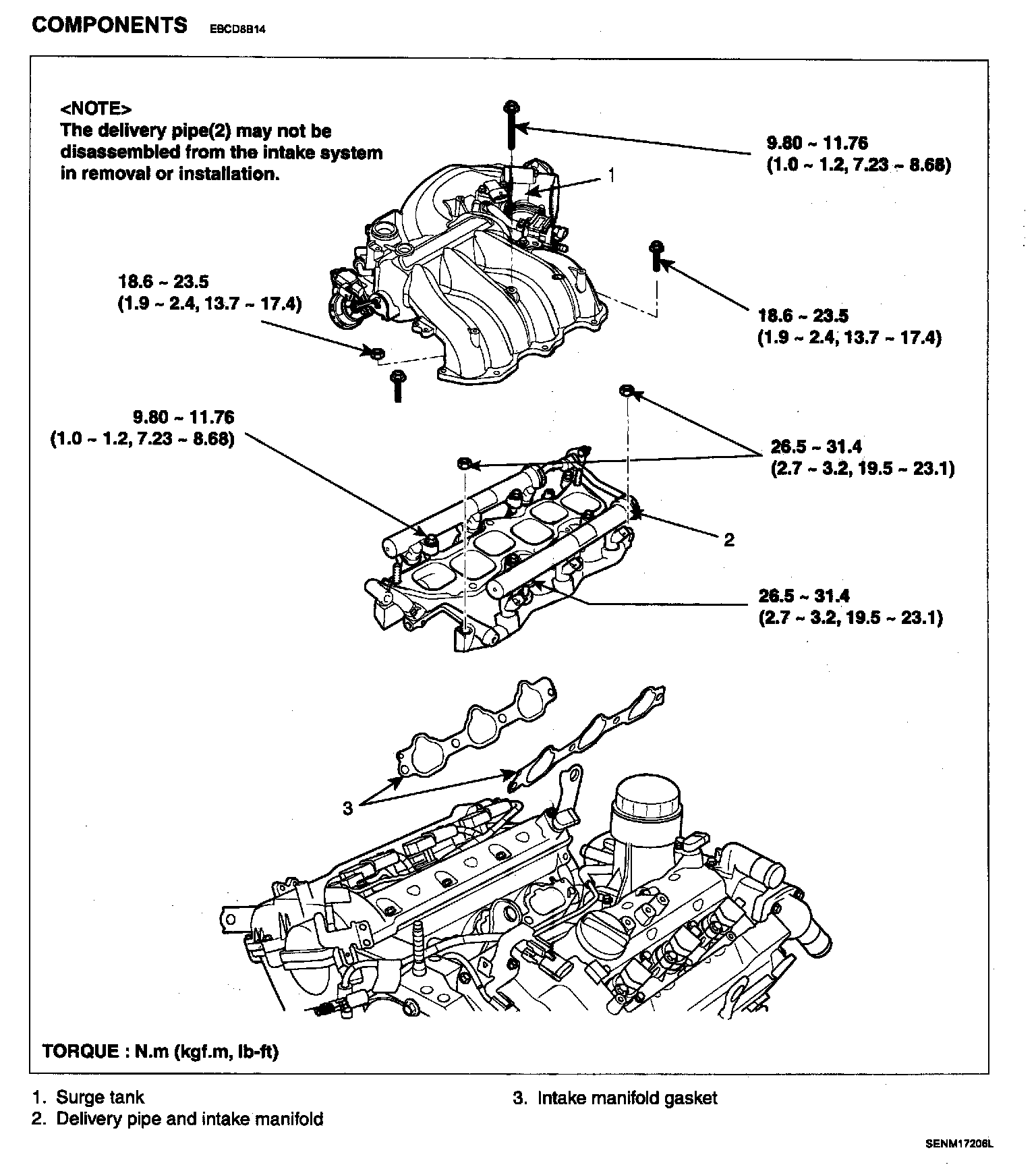 18.62 - 23.52 Nm (1.0 - 2.4 kgf.m, 13.74 - 17.36 lb-ft) - Short bolts 3EA/Nuts 2EA