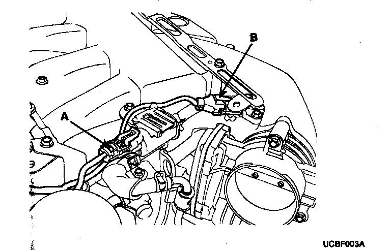 5. Disconnect the ETC connector (A) and the knock sensor connector (B).