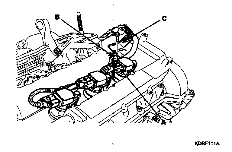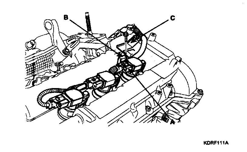 b. Disconnect the RH ignition coil connector (A), the condenser connector (B) and remove the wiring bracket (C)