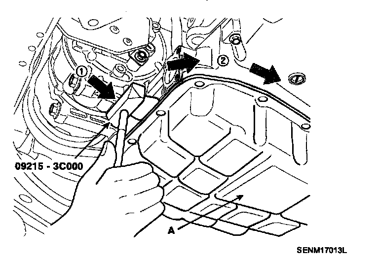 Insert the blade of SST (09215-3C000) between the upper oil pan and lower oil pan, and cut off applied sealer and remove lower oil pan.