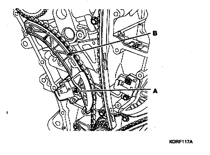 17. Remove the LH timing chain auto tensioner (A) and the LH timing chain tensioner arm (B).