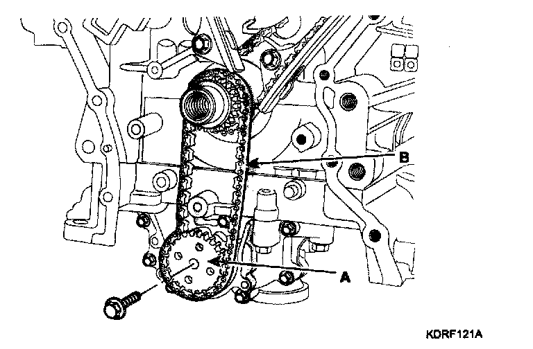 14. Remove the oil pump chain sprocket (A) and the oil pump chain (B).