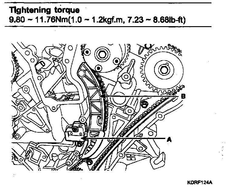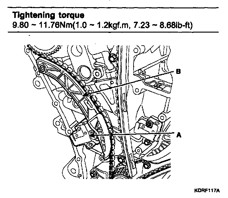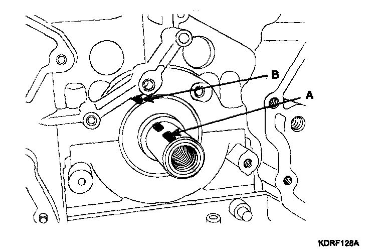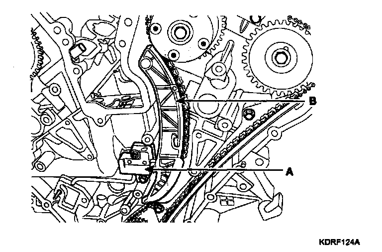 1. The key (A) of crankshaft should be aligned with the timing mark (B) of timing chain cover. As a result of this, the piston of No.1 cylinder is placed at the top dead center on compression stroke.