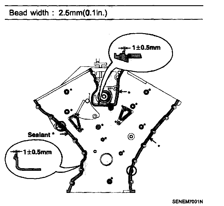 b. Before assembling the timing chain cover, the liquid sealant TB1217H should be applied on the gap between cylinder head and cylinder block. The part must be assembled within 5 minutes after sealant was applied.