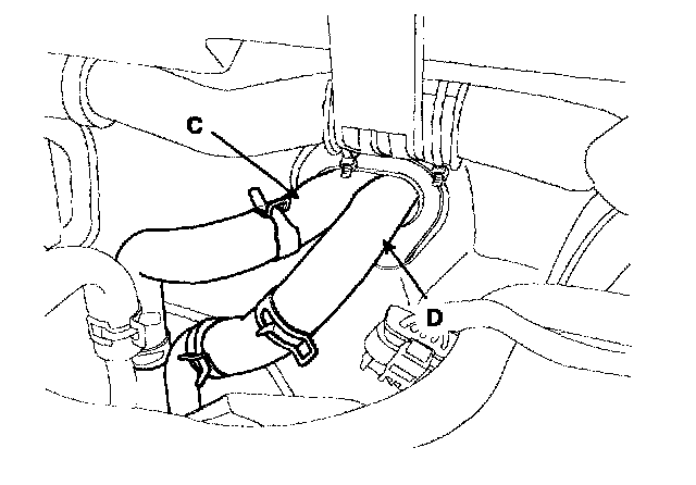 5. Disconnect the inlet (C) and outlet (D) heater hoses from the heater unit.