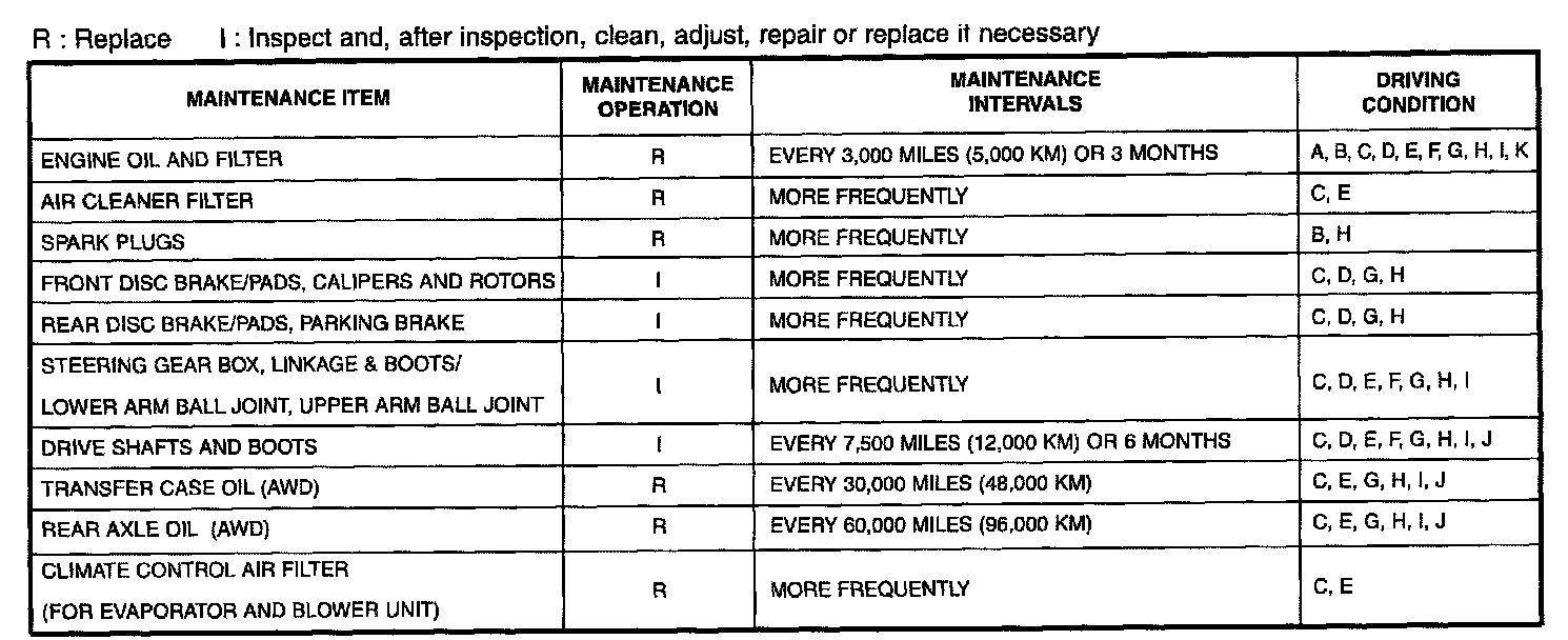 The following items must be serviced more frequently on cars normally used under severe driving conditions. Refer to the chart below for the appropriate maintenance intervals.