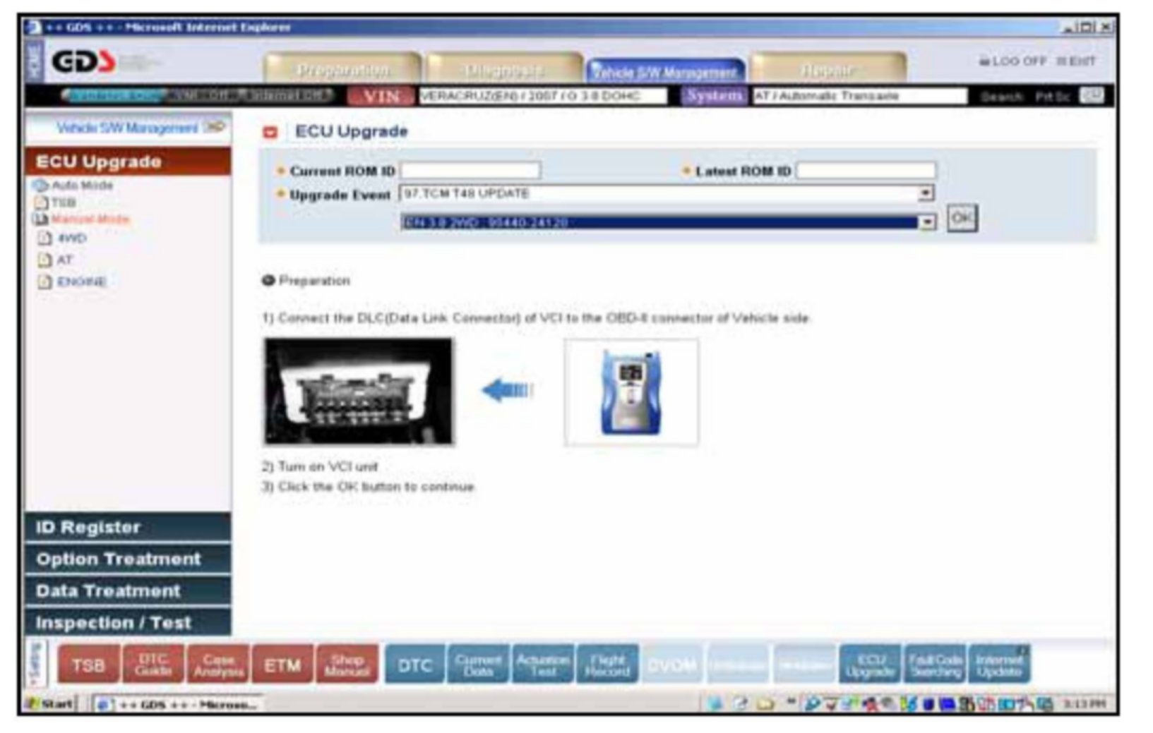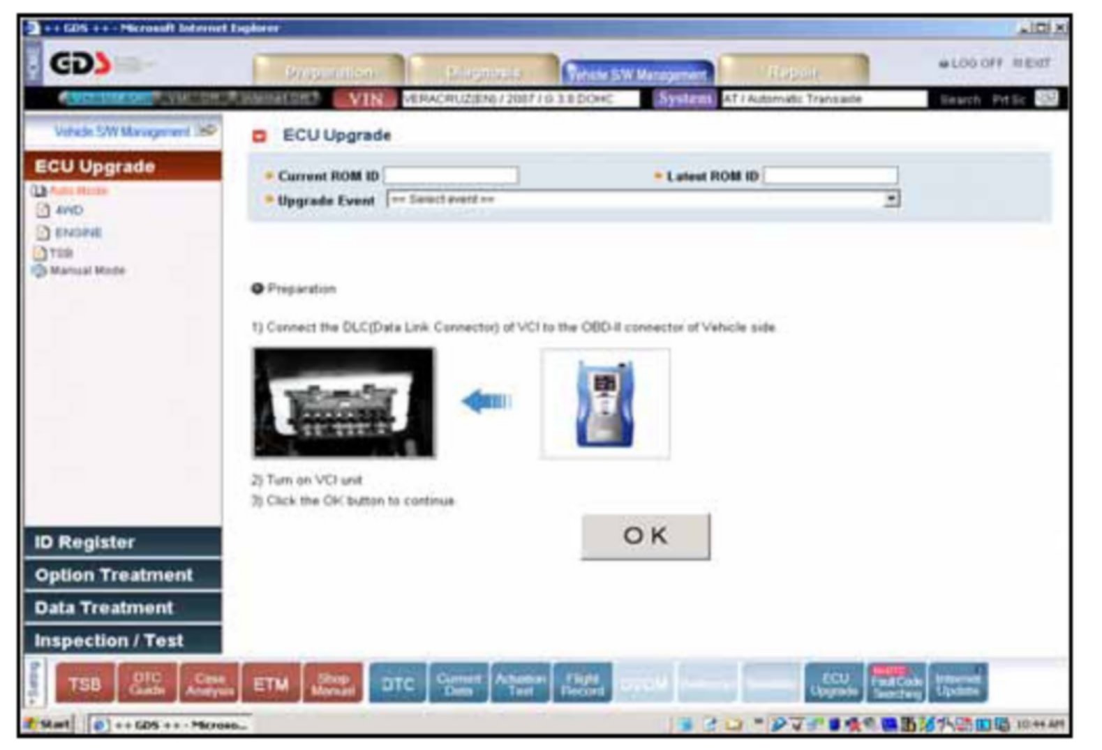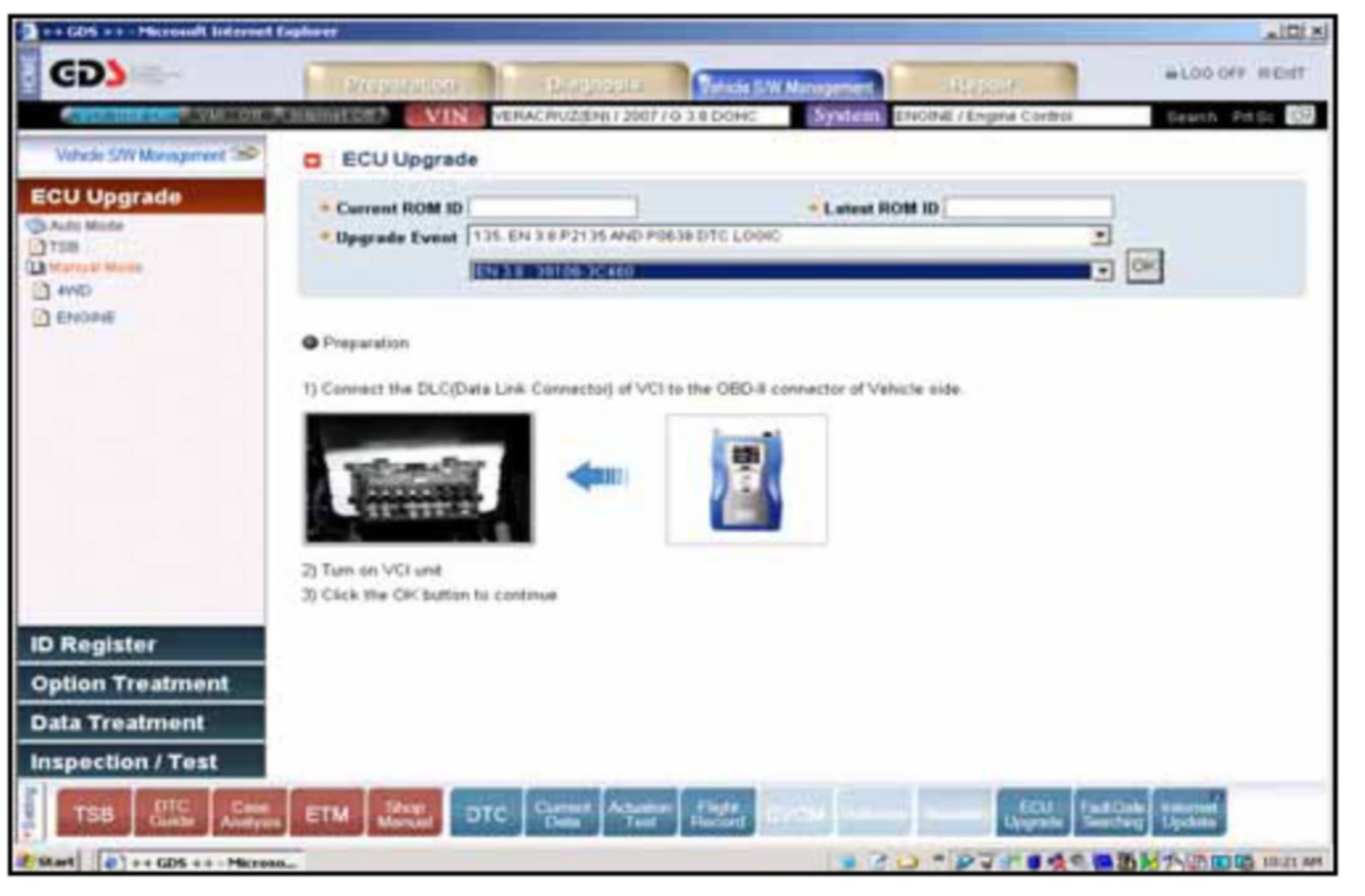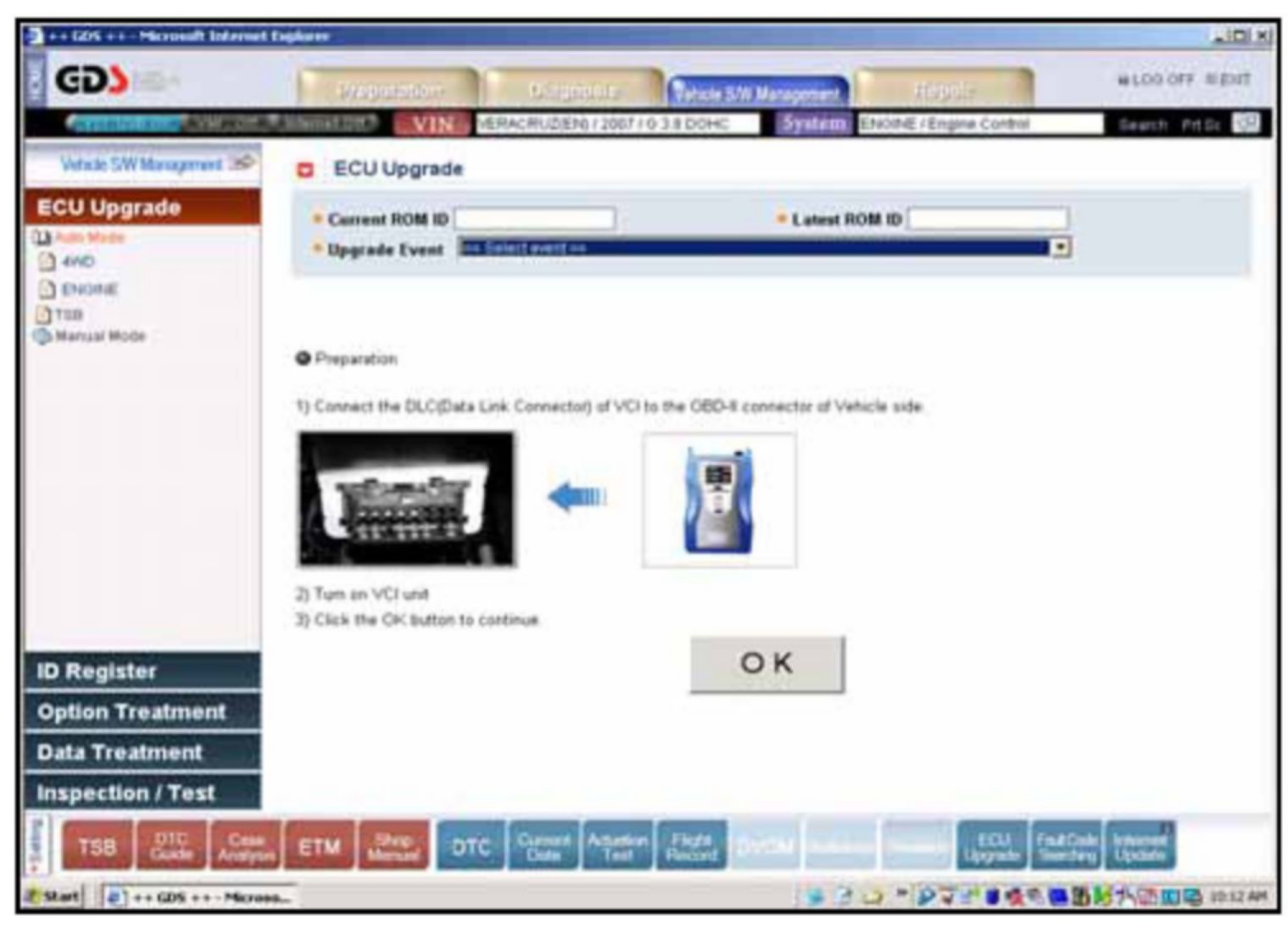 3. Select Auto Mode and ENGINE under the ECU Upgrade column on the left and click OK. The GDS will read the ROM ID.