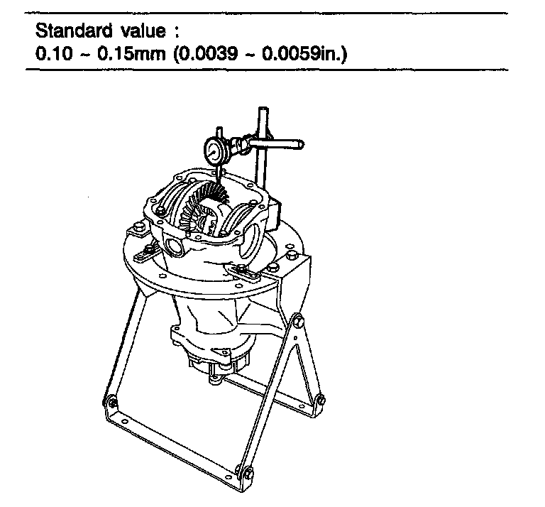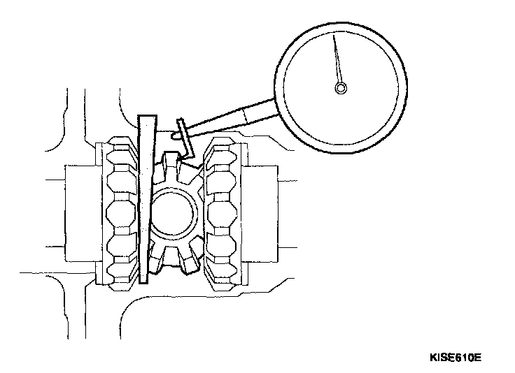 1) Fix the side gear with a wedge so it cannot move and measure the differential gear backlash with a dial indicator on the pinion gear.