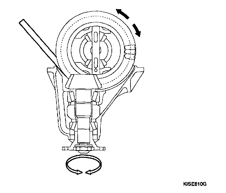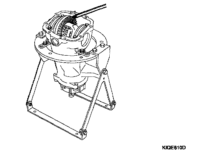 2) Insert a brass rod between the differential carrier and the differential case, and then rotate the companion flange by hand (once in the normal direction, and then once in the reverse direction) while applying a load to the drive gear so that some torque (approximately 25-30Nm) is applied to the drive pinion.
