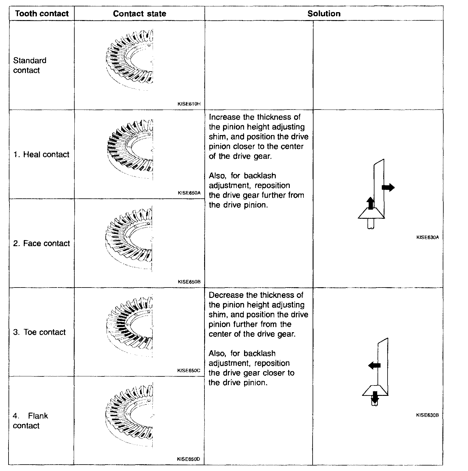 - Tooth contact pattern is a method for judging the result of the adjustment of drive pinion height and final drive gear backlash. The adjustment of drive pinion height and final drive gear backlash should be repeated until the tooth contact patterns are similar to the standard tooth contact pattern.