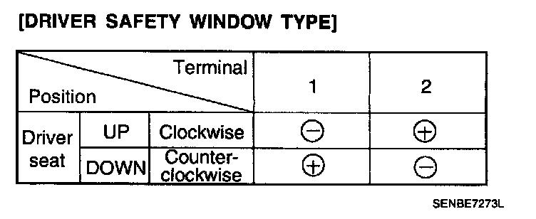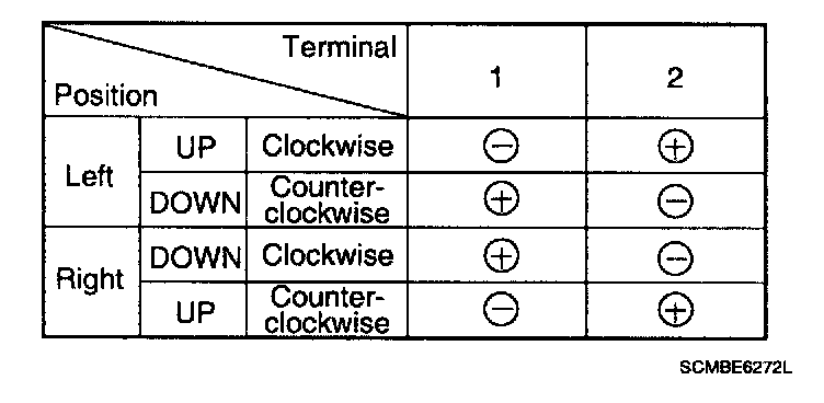 4. Connect the motor terminals directly to battery voltage (12 V) and check that the motor operates smoothly. Next, reverse the polarity and check that the motor operates smoothly in the reverse direction. If the operation is abnormal, replace the motor.