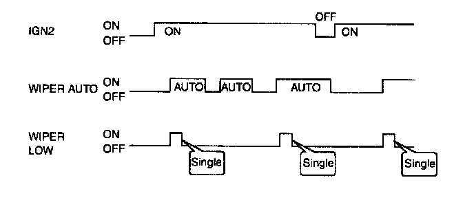 3. A single wipe will be performed whenever rain has been detected (Rain Detected signal from Rain sensor) and the wiper switch is moved to the AUTO position. But a single wipe will not be performed when the wiper switch is moved to the AUTO position and OFF signal is being received from Rain sensor Hut if the wiper switch is moved to AUTO position for the first time since vehicle ignition switch is turned on then a single wipe will be performed regardless of Rain Detected or OFF signal.