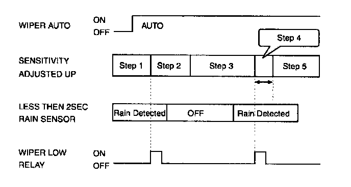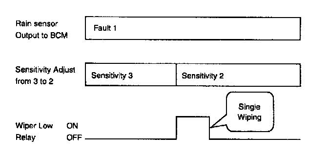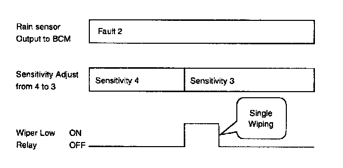 4. The drive may adjust the rain sensor performance by adjusting the sensitivity input. When in automatic mode, the BCM will perform a single wipe each time the sensitivity is adjusted upward to a more sensitive setting (downward more then one step). This single wipe will only be performed if Rain Detected signal is being received from the Rain sensor. If the sensitivity adjustment is adjusted upward more than one sensitivity, the BCM will only perform a single wipe unless the time between Increases is more than 2 seconds.