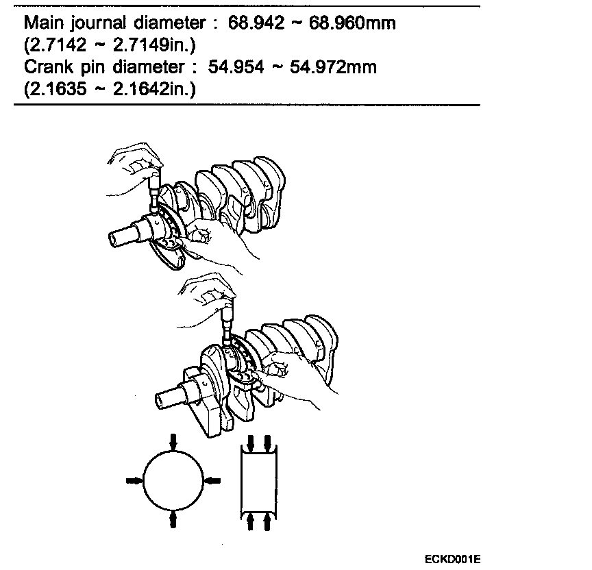 Using a micrometer, measure main journal and crank pin.
