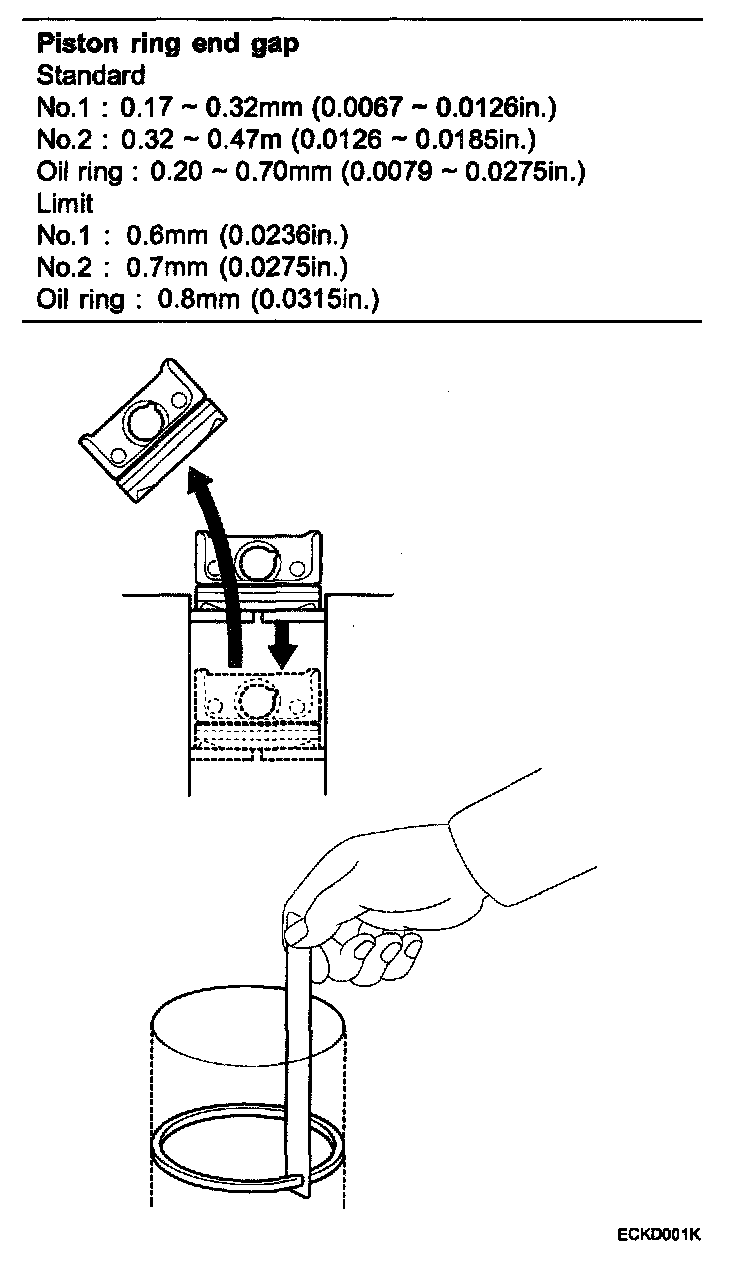 To measure the piston ring end gap, insert a piston ring into the cylinder bore. Position the ring at right angles to the cylinder wall by gently pressing it down with a piston. Measure the gap with a feeler gauge. If the gap exceeds the service limit, replace the piston ring. If the gap is too large, recheck the cylinder bore diameter against the wear limits. If the bore is over the service limit, the cylinder block must be replaced.