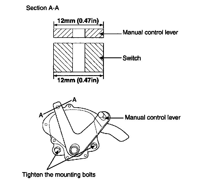 4. Loosen the transaxle range switch body mounting bolts and then turn the transaxle range switch body so the hole in the end of the manual control lever and the hole (cross section A-A in the figure) in the flange of the transaxle range switch body flange are aligned.