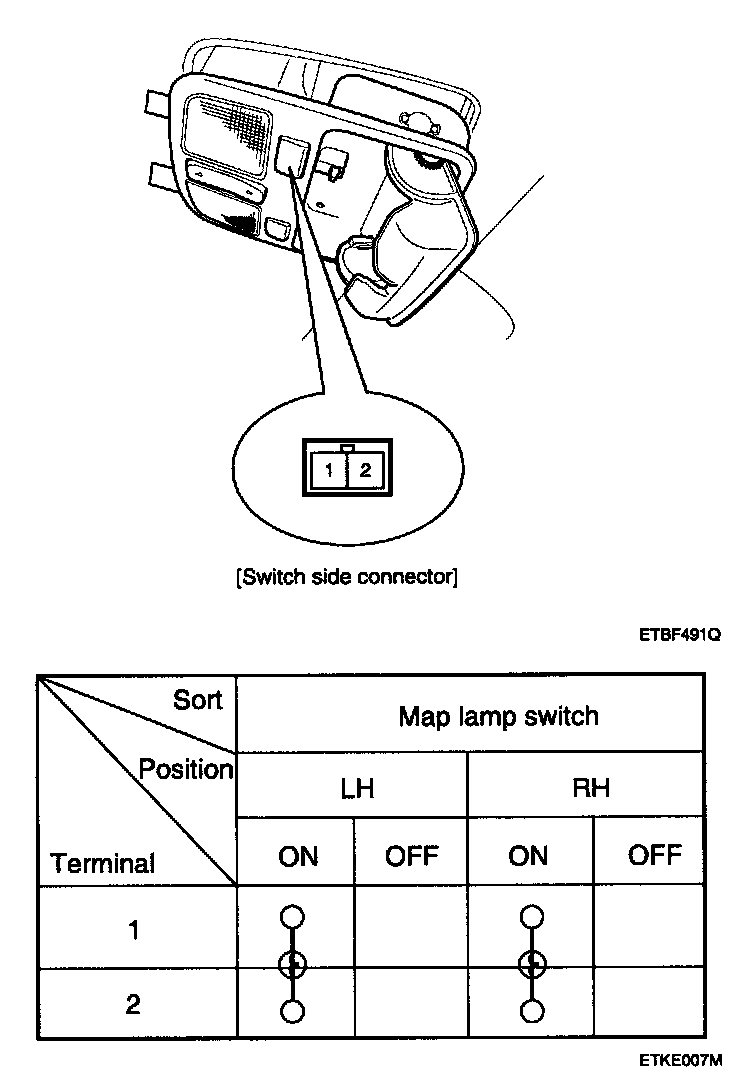 OVERHEAD CONSOLE LAMPINSPECTIONRemove the overhead console lamp assembly then check for continuity between terminals. It the continuity is not as specified, replace the map lamp switch.