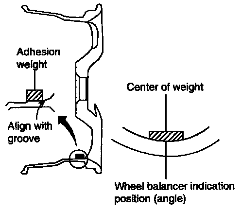 b. When installing balance weight to wheels, set it into the grooved area on the inner wall of the wheel as shown so that the balance weight center is aligned with the wheel balancer indication position (angle).