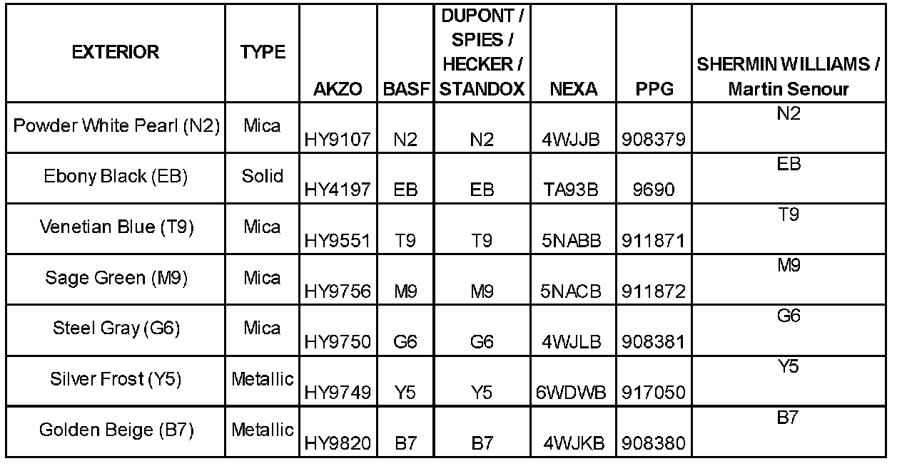This TSB provides information on 2008 model year exterior colors used on the Azera. It includes Hyundai paint codes and several paint manufacturers formula codes.