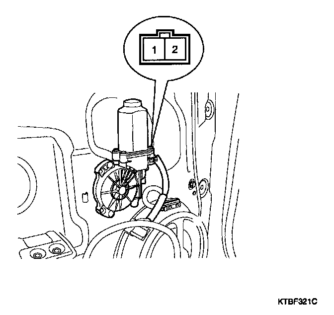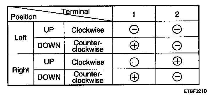 4. Connect the motor terminals directly to battery voltage (12 V) and check that the motor operates smoothly. Next, reverse the polarity and check that the motor operates smoothly in the reverse direction. If the operation is abnormal, replace the motor.